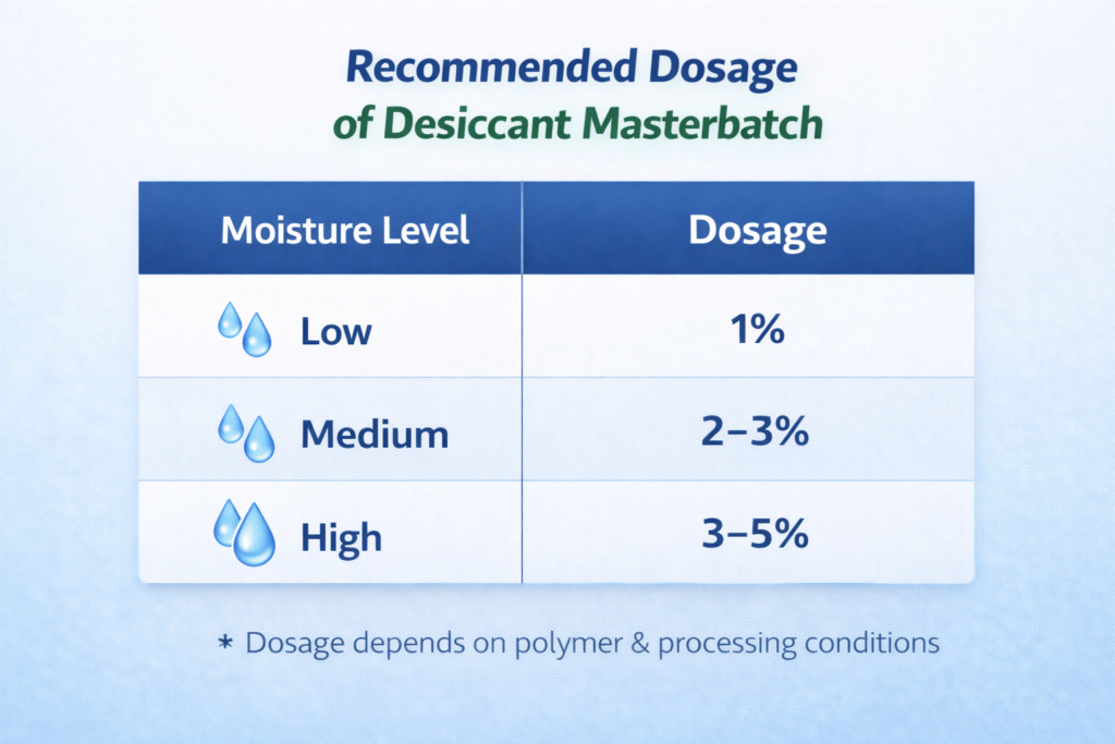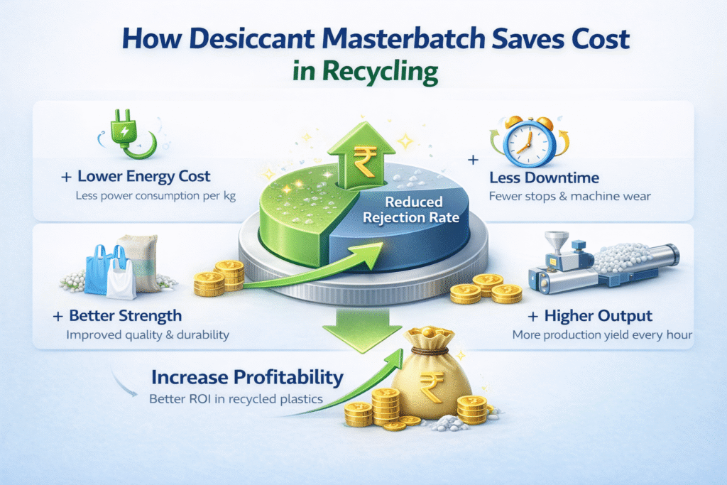 A high-quality Desiccant Masterbatch for recycled plastic acts as an in-process moisture neutralizer, ensuring stable extrusion, superior surface finish, and consistent mechanical properties.