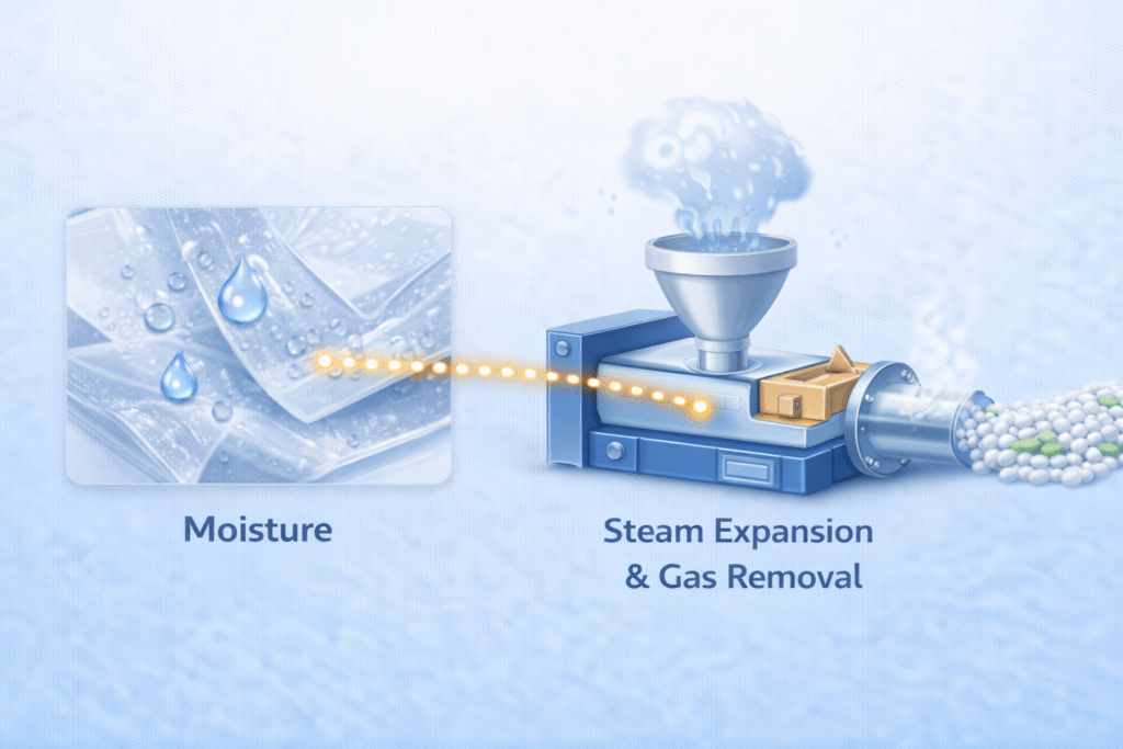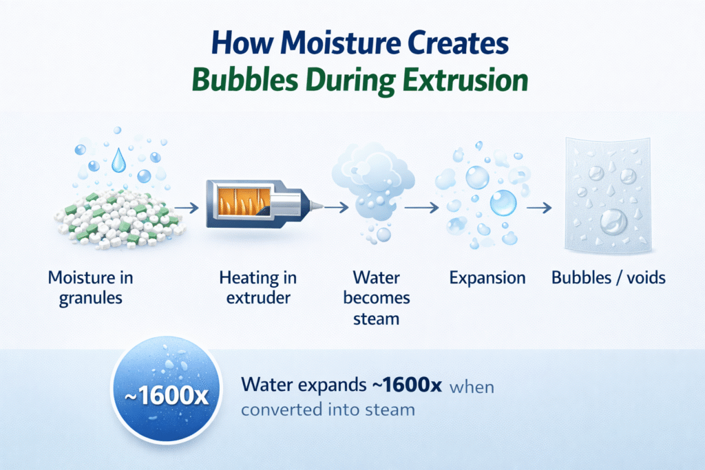Even 0.1%–0.3% moisture content can cause severe defects during extrusion or molding.